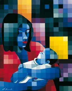 La stesura del colore all’interno delle composizioni di Pieramati è costituita dal principio della visibilità delle immagini ed è costituita da “ tessere cromatiche”, diritte o squadrate, secondo le diverse necessità stilistiche delle forme, così come per l’appunto si usa fare nei mosaici. Il curioso insieme di questo tessuto degradante, in colori scuri e chiari, determina all’interno dei dipinti una continua vibrazione cromatica, molto frazionata, che qualifica il gioco della luce e delle ombre, che segna le frontiere lineari del disegno rappresentato, in stretto rapporto col senso plastico dei colori della tavolozza personale di Pieramati.Una tavolozza, si noti bene, che è frammentata e strutturata non da leggi cubistiche o da reminiscenze dinamico-futuristiche , ma unicamente rivolta all’attenzione del fruitore che è costantemente sollecitato a decifrare la bellezza delle forme figurali e poetiche. L’opera “ Studio con chitarra” del 1978, che è figurativa, rivela sin da quegli anni le tendenze di Pieramati di scomporre il colore con una tissularità. frammentaria , in seguito è sempre più stato portato a svolgere “Il Computerismo”, sperando nel futuro di sintetizzare maggiormente l’insieme dei problemi che gli vengono ispirati da questo genere di ricerche.
