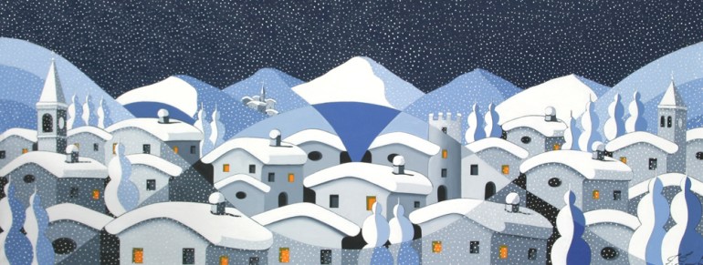 Su tutto si adagia la neve. Tranne che sui campanili, quasi a dettarne una simbologia metafisica. Anche gli alberi – la sola natura visibile – hanno una conformazione volutamente uniforme e simbolica.